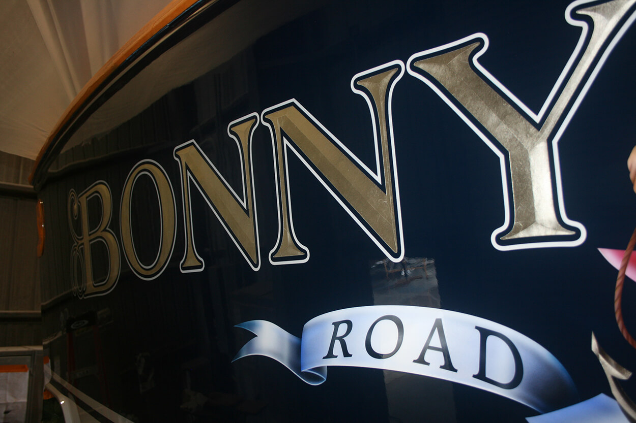 Bonny Read Harbour Road BVI Boat Transom bevel white gold letter style