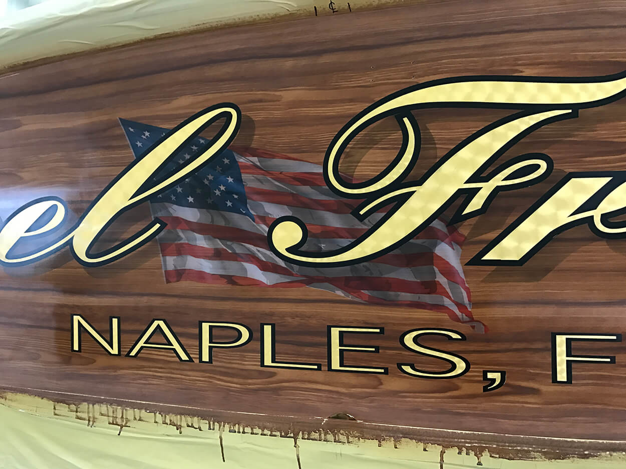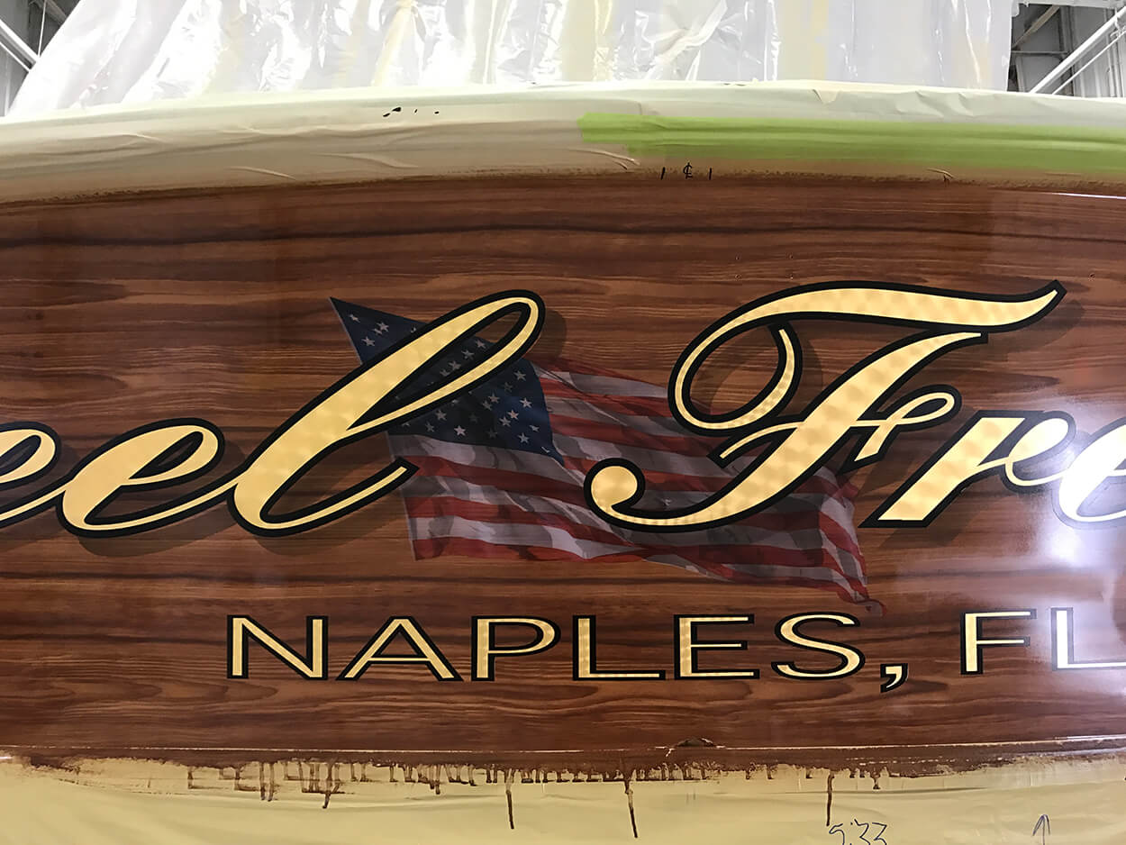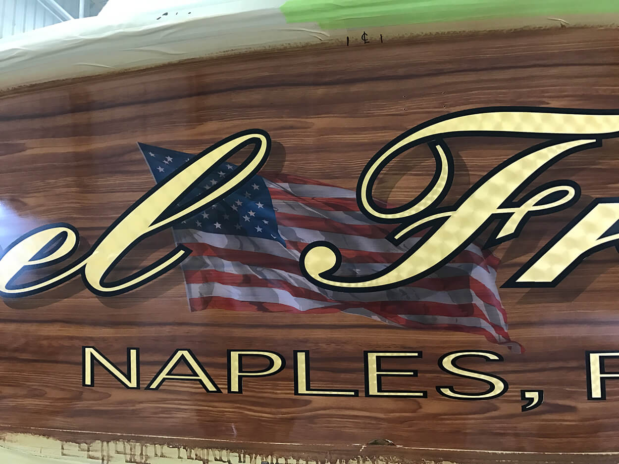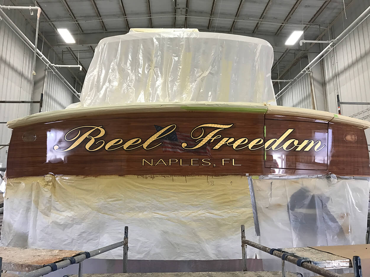 Reel Freedom Naples Florida Boat Transom lettering detail engine turned gold leaf