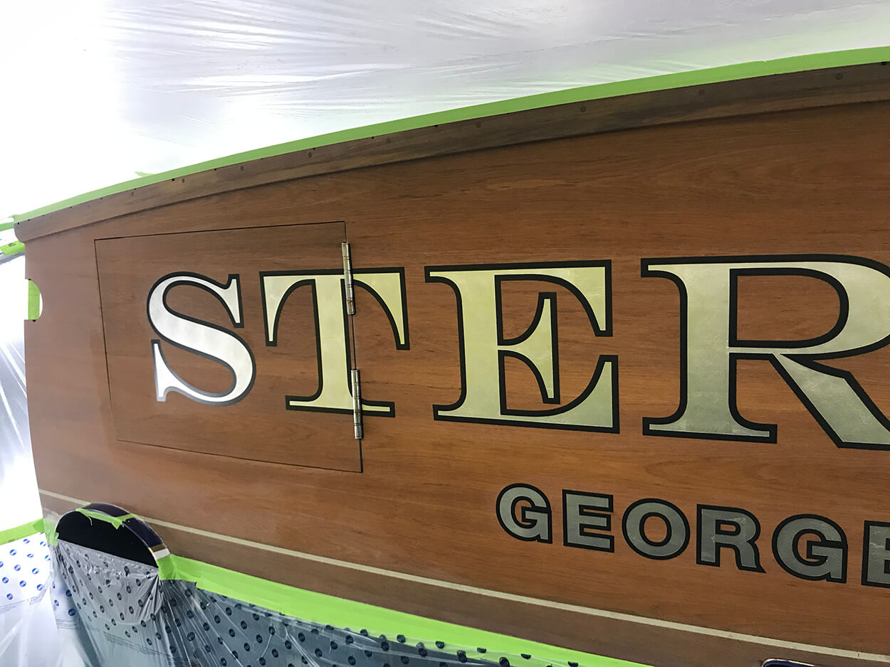 Sterling George Town Boat Transom closeup outside name design lettering gold leaf