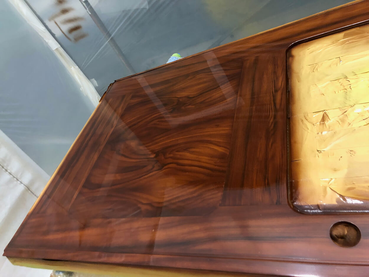 Brand new in 2019, Lisa G received a full faux teak application to her transom, toe rail, salon door and helm pod as well as new name in 2019 at the Viking Yacht plant in New Gretna, New Jersey. This is the second Lisa G Everett Nautical has painted.
